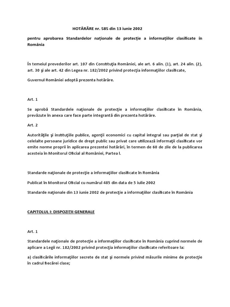 585 din 13 iunie 2002 pentru aprobarea standardelor naţionale de protecţie a informaţiilor clasificate în românia. 585 din 13 iunie 2002 pentru aprobarea standardelor na. 485 din 5 iulie 2002; Hotărâre nr.585 din 13 iunie 2002:.. 107 din constitutia romaniei, ale art.